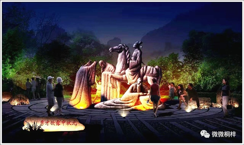 状元广场,“喝茶考状元”:广场成三角形,占地约706.5平方米,由天然花岗岩铺设。广场中央雕刻有秀才饮露中状元场景像。相传在很久以前,一个秀才进京赶考,在赶考途中生病了,一个下山化缘的老方丈见状便拿出一撮茶叶泡水给秀才喝下。秀才喝下茶水,渐渐好转,这才没有错过时间。后来,秀才高中状元,这才有了秀才饮露中状元的传说。广场上的所有塑像都是由天然花岗岩雕刻而成,最高和最宽处均为3.5米。