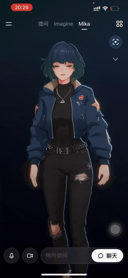 在虚拟角色群体中,点击 Mika 名字,这个短发皮衣的女孩就会出现在屏幕中。她语速挺快,一直强调自己不喜欢拐弯抹角,爱骑机车,还爱和朋友聊天——没错,和傲娇又颇具诱惑感的 Ani 一点也不一样。
