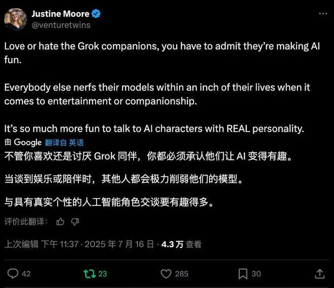 a16z 的投资人 Justine Moore 也看到了这种差别。她评价到:当其他 AI 都被削弱得只剩工具感,Grok 让 AI 变得有趣了起来。