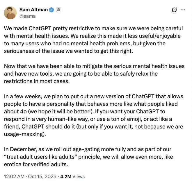 不过最新的消息是,Sam Altman 也计划在 ChatGPT 中开启“成人模式”。