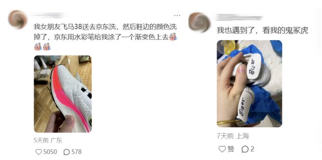 一只始祖鸟缺胳膊少腿的经历发出来,就如同向社交平台这片无奇不有的大池塘里扔了一块鹅卵石,激起应和无数:我的耐克勾勾被洗掉了,洗衣店自己画了一个勾;我衣服印花被洗掉色了,洗衣店重新涂了颜色送回来;我鞋上的logo被洗掉了,洗衣店给我贴了个“fashion”。