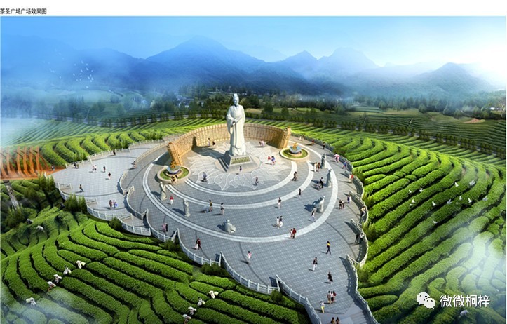 到茶圣广场,看中国第一高“茶圣”:据森航集团相关负责人介绍,在建的茶圣广场上的陆羽像是中国第一高茶圣像。通往茶圣广场的花岗岩石阶共计12个平台365阶,每个平台中间刻有汉白玉浮雕,每阶按月雕刻日期。茶圣广场的地面由两片茶叶形状错叠而成,用天然花岗岩铺设,约2592平方米。广场中央伫立着茶圣陆羽的雕刻,雕刻分9层,由56块共888吨汉白玉雕刻而成,雕刻底座长8米,宽6米,高2米,像身高18.8米,加上底座高20.8米,其高度目前居全国第一。雕像正面刻有陆羽简介;背面刻有成弧形的《茶经》画卷浮雕,弧长16米;左右分别刻有“茶”字。神像周围分别蹲站着6位由天然花岗岩雕刻而成的茶神,他们分别是白居易、陆游、朱权、康熙、吴觉农、张天福,其中站像和坐像分别有3尊,每尊站像高3米,8吨左右,每尊坐像2.1米,10吨左右。